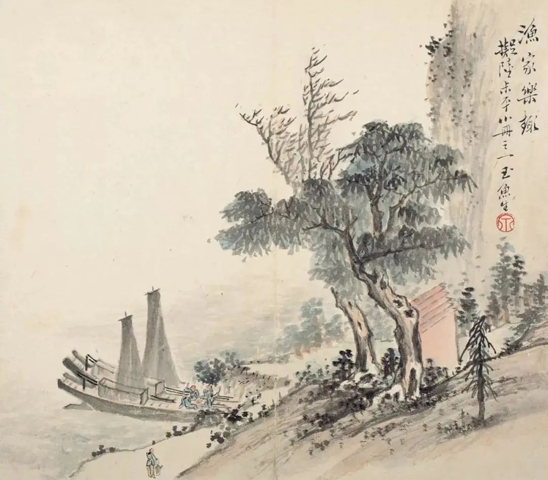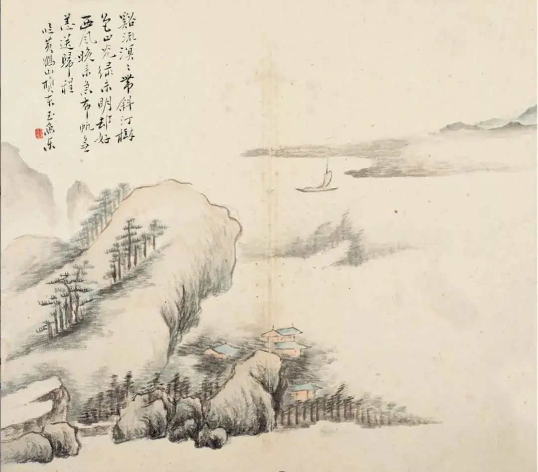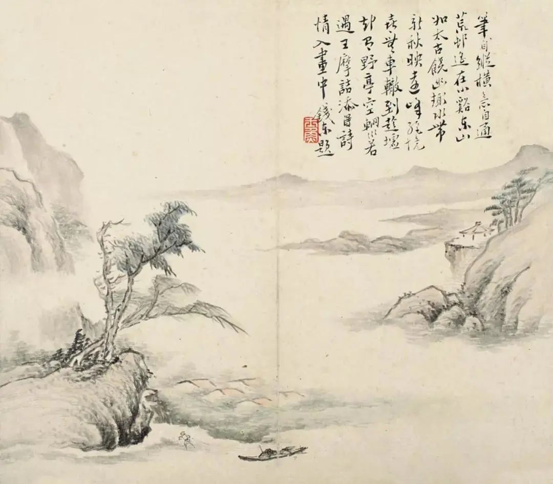 在清初画坛的璀璨星河中,钱东的《山水册》犹如一缕隐逸的清风,以独特的笔墨语言与精神境界,在传统山水画中开辟出一条“另类”的审美路径。这位侨寓扬州的杭州文人,以诗、词、曲、画四绝的才华,在《山水册》中构建了一个超越现实的理想国,其笔墨苍润间的留白与隐喻,恰似一曲无声的文人独白。 钱东师承恽寿平没骨技法,却未囿于其柔媚之风。在《山水册》中,他以干笔皴擦与湿墨晕染的碰撞,创造出一种“苍润共生”的质感。如《烟云峭壁》一帧,山石以浓墨勾骨,淡墨渲染,枯笔皴擦出肌理,而云雾则以湿墨层层积染,形成刚柔并济的视觉张力。这种笔墨的“反叛”,既是对恽寿平技法的解构,亦是对“四王”正统山水的回应——他以更自由的笔触,消解了程式化的山石结构,赋予画面以呼吸感。 钱东的构图堪称“留白艺术”的典范。在《渔家乐趣》中,画面仅以一叶扁舟、数点归鸦占据右下角,其余大半留白,却以舟行轨迹与鸦群飞向暗示出浩渺水域。这种“以虚写实”的手法,不仅拓展了空间维度,更暗含道家“无为”的哲学观。而在《关山萧索》中,枯树、孤亭与远山构成三角构图,留白处似有寒风呼啸,将萧瑟之意推向极致。留白在此不仅是形式语言,更成为情感表达的载体。