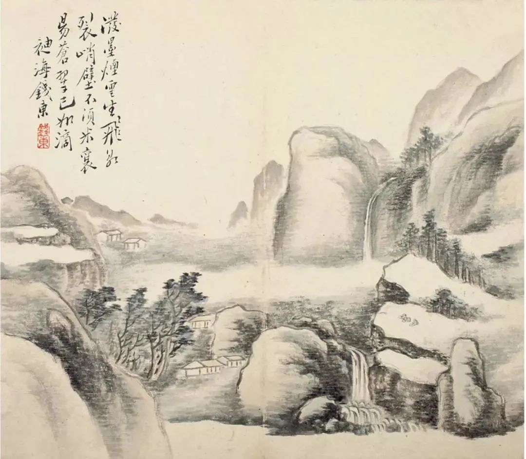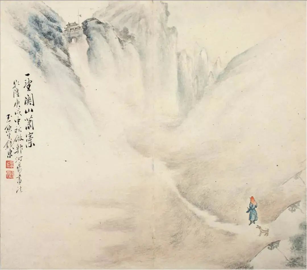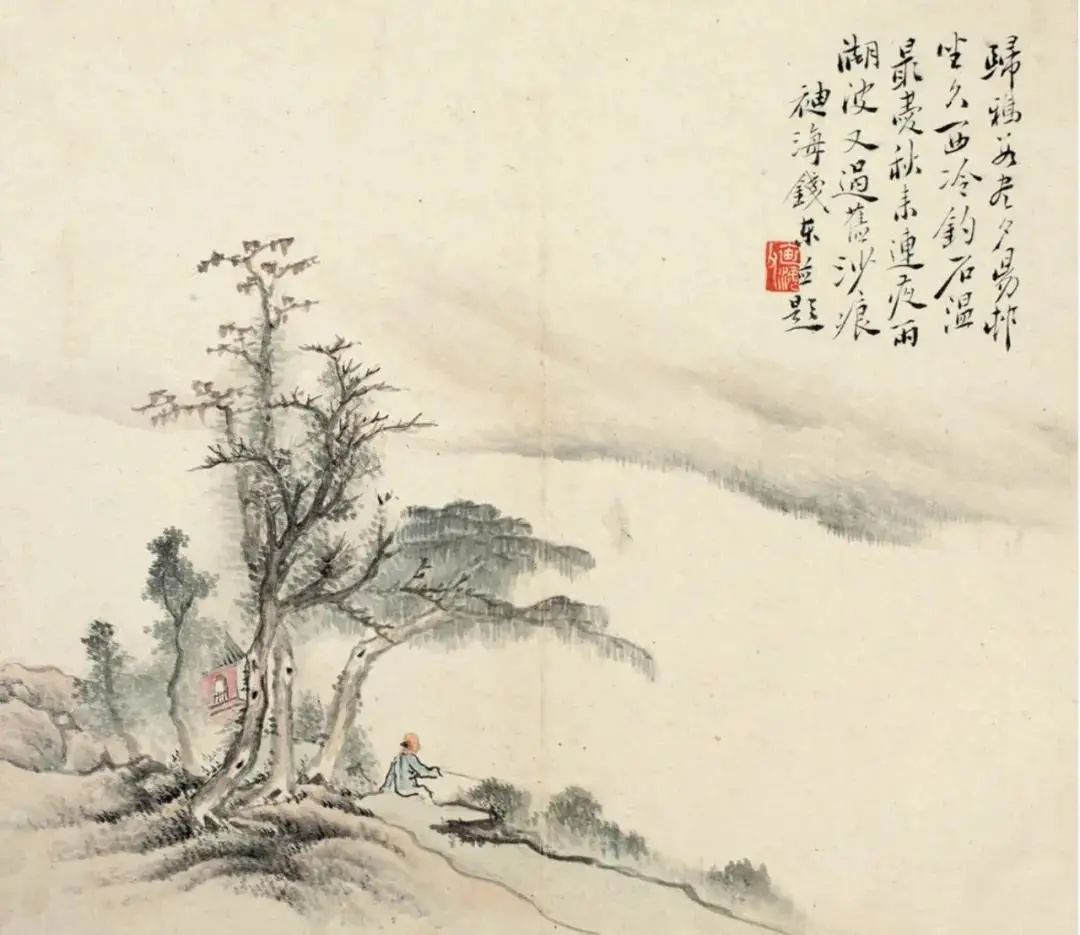 钱东的《山水册》并非纯粹的隐逸之歌。在《晚照峰斜》中,夕阳将山峦染成金红,归鸟掠过天际,看似宁静的画面中,却透露出对时光流逝的怅惘。这种“出世”的景致与“入世”的感怀交织,使作品超越了传统山水画的“可居可游”范式,成为文人精神世界的镜像。正如其好友改琦所绘《钱东像》中,人物手持书卷、神态淡然,恰与《山水册》中“澄性养身、超脱世尘”的气质相呼应。 在清初“四王”主导的画坛中,钱东的《山水册》因未遵循正统笔法而长期被边缘化。然而,其“逸品”特质——笔墨的自由性、构图的实验性、意境的私密性,却使其成为后世研究的“另类”样本。近年来,随着对文人画精神内核的重新审视,钱东的作品在拍卖会上屡创高价,其《山水册》更被视为“清初逸品”的代表作之一。这种价值的重估,恰印证了艺术史中“边缘”与“中心”的辩证关系。